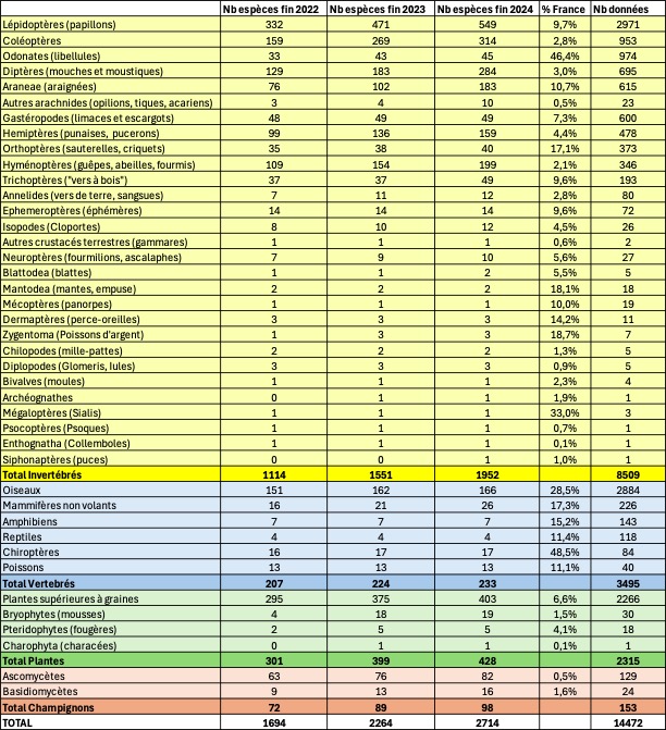 Pour l’instant, donc, l’exploration continue et le plafond est encore loin d’être atteint, car pour la seule année 2024, nous avons ajouté 450 espèces sur la ferme, portant le total à 2714 espèces connues. Ce tableau livre le détail du nombre d’espèces connues sur la ferme, et de la progression de cette connaissance au cours des trois années.