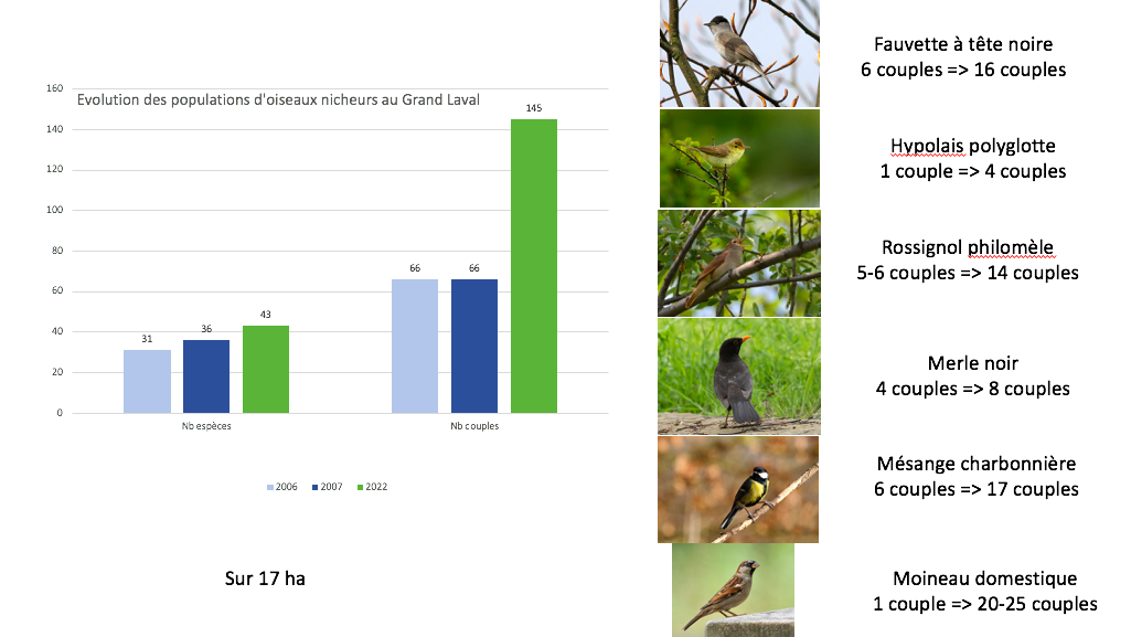 Et les résultats sont là. Sur la ferme du Grand Laval, Sébastien Blache avait recensé l’ensemble des couples nicheurs de tous les oiseaux sur les 17 ha historiques de la ferme, lorsqu’il l’a reprise en 2006 (recensement reproduit en 2007). En 2022, nous avons réitéré le même recensement, et il est en cours en 2023.