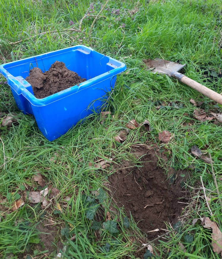 Car ce n’est pas une mince affaire. Le protocole employé est le « test bêche ». Cela consiste à creuser 6 petits trous de 20 cmsur 20 cm et 25 cm de profondeur à l‘aide d’une bêche, et d’y extraire tous les vers de terre qu’on trouve. Cela paraît petit, mais en fait, la quantité de terre est importante ! Il faut ensuite trier et effriter la terre pour y extraire les vers de terre : environ 45 minute par placette. Donc une parcelle de 6 trous nécessite au moins 4h de travail.