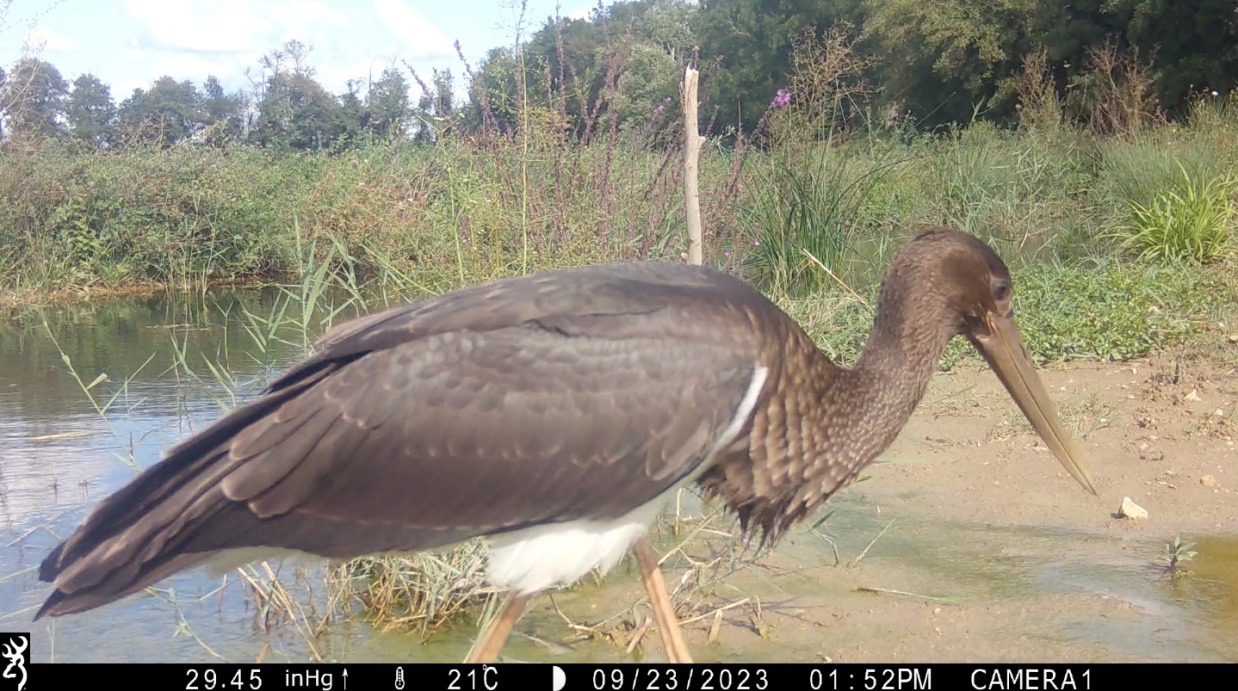 Une jeune Cigogne noire a fait halte lors de sa migration sur la ferme le 23 septembre ! Nous l’avons détectée grâce à nos pièges photos. Cette espèce mythique est en augmentation en France, elle niche dans les grands massifs forestiers (plus rarement dans des arbres isolés). Mais elle ne niche pas encore dans la Drôme, qu’elle traverse cependant lors des deux périodes migratoires. En survol, le plus souvent : l’observer posée est un événement rare. Ici, elle a manifestement été séduite par les effets produits par les ouvrages castor-mimétique dont nous vous parlions dans un précédent post ! C’est la première fois qu’elle se pose sur la ferme.